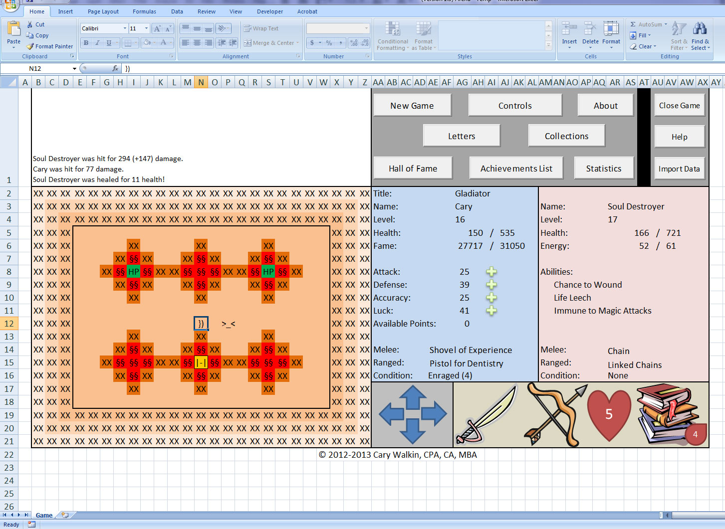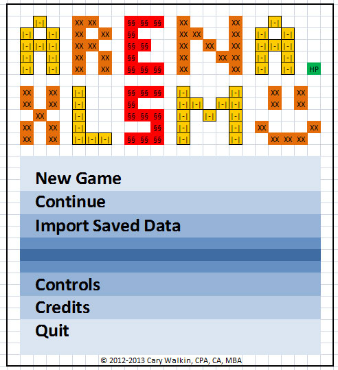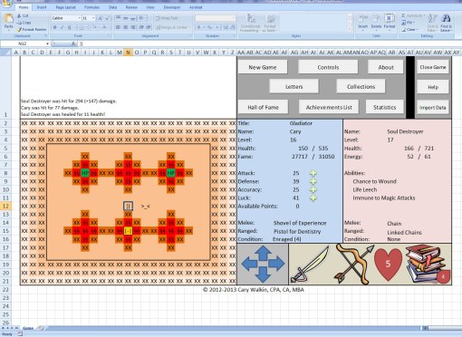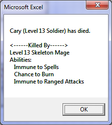 1. The dreaded 1004 run time error. This only appears to impact Excel 2007: Student Edition users (EDIT: not just the student edition but also not all of the editions… thanks for the bug reports, this one is complicated!). I’ve found out what is causing the bug but there is also a cosmetic problem of the blood counter not updating properly for these users in the spreadsheet (it updates fine in the spellbook). This is my top priority so that everyone can play and enjoy the game. To help me with this, I am recruiting tester volunteers who have the Excel 2007: Student Edition (Edit: I am happy to accept volunteer testers with any version of Excel, but please let me know which version you have before you apply). Please send me an e-mail or leave a comment below if you wish to volunteer.